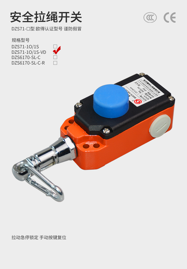 • DZS71-1O/1S-VD安全拉繩開關(guān),拉動式、急停鎖定、藍色復位鍵,2回路(1常開1常閉),金屬殼體、塑膠蓋板。適用于流水線、輸送帶、高空作業(yè)車等機械設(shè)備位移信號控制,保護操作員不受機器傷害。額定絕緣電壓400伏,發(fā)熱電流10安培,工作電壓交流380伏、電流0.8安培,直流220伏、電流0.15安培,防護等級IP65,戶外使用請注意防水措施。