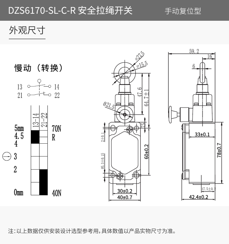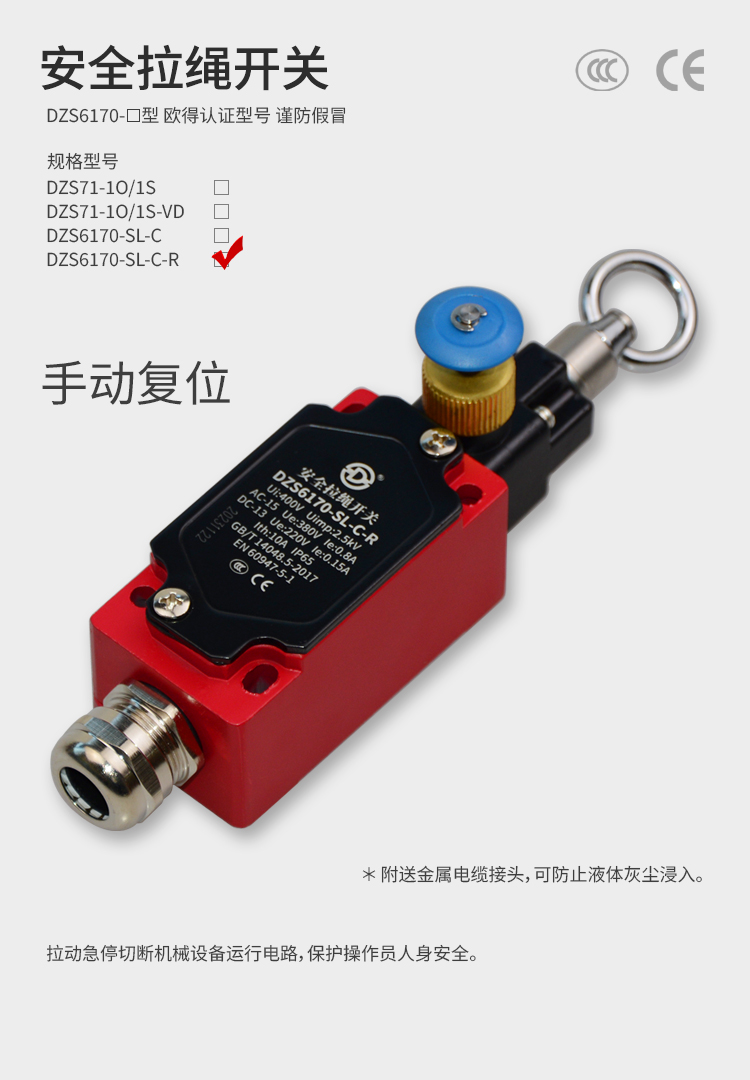 • DZS6170-SL-C-R安全拉繩開關(guān),拉動式、急停鎖定型,藍色按鈕為手動復(fù)位鍵。默認接點為2回路(1常開1常閉)、可定制非標(biāo)2常閉(2NC)。金屬殼體,堅固耐用。適用于流水線、輸送帶、高空作業(yè)車等機械設(shè)備位移信號控制,保護操作員不受機器傷害。額定絕緣電壓400伏,發(fā)熱電流10安培,工作電壓交流380伏、電流0.8安培,直流220伏、電流0.15安培,防護等級IP65,戶外使用請注意防水措施。