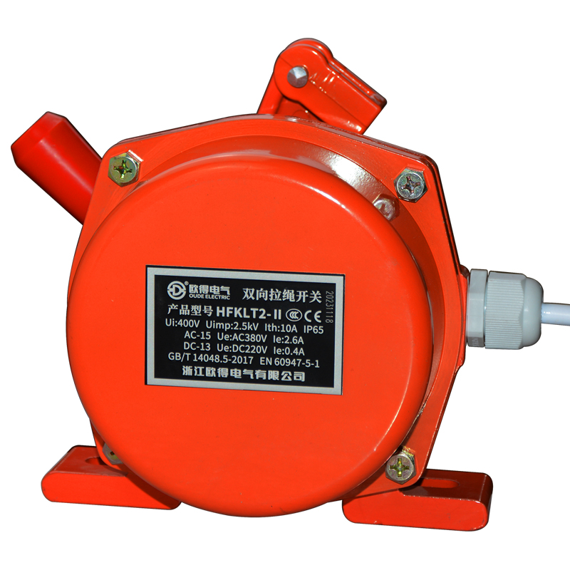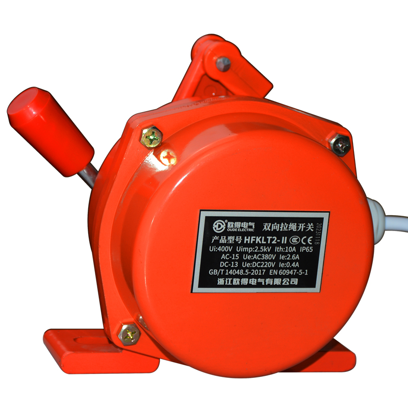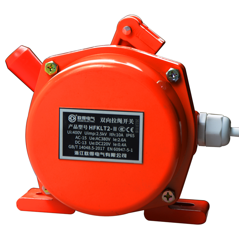 HFKLT2-Ⅱ雙向拉繩開關(guān),是用于膠帶運輸機現(xiàn)場,緊急事故停機的一種保護裝置。當緊急事故發(fā)生時,在現(xiàn)場任意處啟動拉繩開關(guān),均可發(fā)出停機信號。絕緣電壓400伏,發(fā)熱電流10安培,工作電壓電流交流380伏、2.6安培,直流220伏、0.4安培,防護等級IP65。