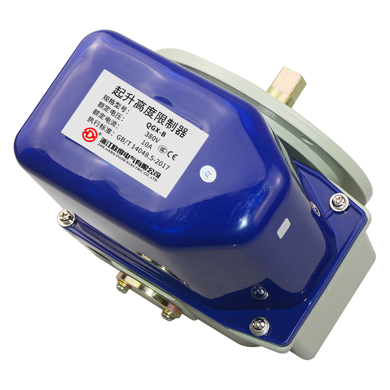 起升高度限制器(QGX-B),卷筒有效工作圈數(shù)0~80圈。絕緣電壓400伏,發(fā)熱電流10安培,工作電壓電流交流380伏、2.6安培,直流220伏、0.4安培,防護(hù)等級(jí)IP54。