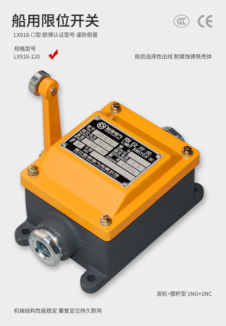 • LX918-120船用限位開關,滾輪擺桿式,鑄鐵耐腐蝕,船舶機械,歐得行程開關。額定絕緣電壓400伏,發(fā)熱電流10安培,工作電壓電流交流380伏、2.6安培,直流220伏、0.4安培,防護等級IP56。適用于船舶、海洋平臺、港口碼頭等各種機械設備在電器設備控制回路中能限制行程的限位開關。