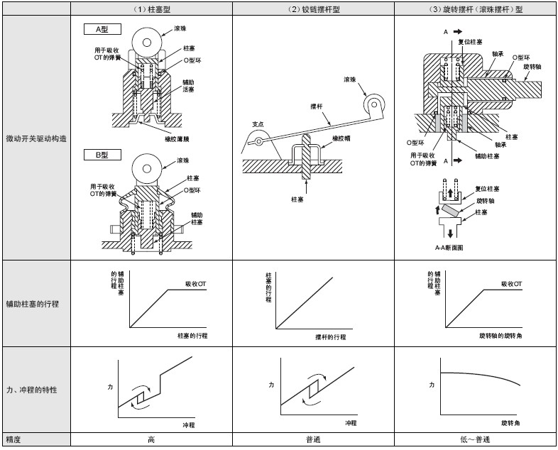 ■ 限位開關的概念限位開關,指為保護內(nèi)置微動開關免受外力、水、油、氣體和塵埃等的損害,而組裝在外殼內(nèi)的開關,尤其適用于對機械強度和環(huán)境適應性有特殊要求的地方。 ■ 內(nèi)置微動開關驅動機構對于限位開關來說,微動開關的驅動機構是與密封性能和動作特性直接相關的重要部分。其構造分為三類,如下表所示。 (1)活塞型 (2)鉸鏈擺桿型 (3)旋轉擺桿型 ![]()