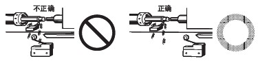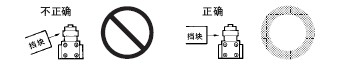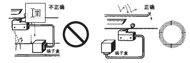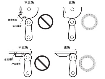 ● 關于連接 · 請不要在1個開關的接點上連接異極、異種的電源。 · 在電路設計時請不要在接點間加電壓。(可能導致混觸熔化) · 即使在發(fā)生異常情況時, 也不要出現(xiàn)短路的電路。(可能導致導電部位的熔斷) · 開關用于電子電路(低電壓· 低電流) 1. 接點的振動、震顫會帶來問題時,請采取下面的措施。 ● 關于使用環(huán)境 · 請不要在有引火性氣體、爆炸性氣體等環(huán)境中單獨使用開關。隨著開關引起的電弧發(fā)熱,會造成失火或爆炸等原因。 · 限位開關也會由于在室外或特殊的切削油的關系導致開關材質變質及劣化,因此選擇機種時請垂詢。 · 請不要在有熱水(+60℃以上) 的地方和水蒸氣中使用。 · 操作人員不小心將開關安裝在易發(fā)生誤動作或事故的地方時,請加裝外罩。 · 開關受到連續(xù)的振動和沖擊時,產(chǎn)生的磨損粉末可能導致接點接觸不良和動作失常、耐久性下降等問題。此外,如有過大的振動和沖擊,可能會發(fā)生接點的誤動作和破損等,因此請將其安裝在不會受到振動和沖擊的位置和不會發(fā)生共振的方向上。 ● 關于定期檢查和定期更換 · 在一直按下的狀態(tài)下, 如果開關頻率較低(1次以下/日), 則可能會由于零件的劣化導致復位不良。請事先確認并定期進行檢查。 ● 關于開關的保管 · 請避免在惡性氣體(H2S、SO2、NHO3、Cl2等) 和有塵埃、高溫多濕的環(huán)境中存放開關。 ● 關于耐氣候、耐寒、耐熱規(guī)格 為了提高耐氣候、耐寒、耐熱性能, 使用了硅橡膠, 硅橡膠部分情況下可能產(chǎn)生硅氣體(常溫下可能發(fā)生, 高溫下產(chǎn)生量會進一步增加) 。 這種氣體通過電弧能量反應, 會生成二氧化硅(SiO2) 。二氧化硅(SiO2) 不斷堆積在接點上, 會發(fā)生接觸障礙, 可能影響設備的正常運行。使用前請務必按照實際使用條件(包括環(huán)境、動作次數(shù)) 進行評價, 在確認性能上沒有問題后, 在進行使用。 ● 關于室外使用 · 在有泥水、粉塵的地方, 請使用機械部位密封的橡皮帽限位開關。 ● 關于操作 ·為避免開關的驅動桿急速返回或受到?jīng)_擊, 請考慮操作體(凸輪、擋塊等) 進行操作。以相對快的動作操作開關時, 必須使用能對繼電器和閥門進行充分勵磁且保持行程較長的凸輪和擋塊。 · 在旋轉運動、直線運動時也必須在開關的驅動桿上施加正常的載荷。如下圖所示, 擋塊觸到擺桿時, 動作位置將無法穩(wěn)定。 · 請不要在開關的驅動桿上施加偏載荷, 或者引起局部磨擦。 · 如果從斜面向開關的驅動桿(滾珠) 上施加載荷, 可能會造成驅動桿和旋轉軸的變形、折損,因此請保持擋塊垂直。 · 請設置驅動桿不超過過行程(OT)。過行程(OT)超過限制的話,可能引起故障。安裝時請充分考慮操作總行程后進行調(diào)整。 · 過行程過大時, 可能會誘發(fā)早期的故障。因此在安裝時必須進行調(diào)整,必須事先對操作體的工序進行充分的討論。 · 在針狀按鈕型中, 按鈕的行程和操作體的行程必須在一條垂直線上。 · 請配合驅動桿的特性使用開關。請不要如下圖所示箭頭方向那樣使用滾珠懸臂擺桿型。 · 請不要對驅動桿進行加工而導致動作位置的變化。 ● 擋塊的設計 關于擋塊的速度及角度與驅動桿的關系 <滾珠擺桿型驅動桿> (1)擋塊不會越過驅動桿的情況下